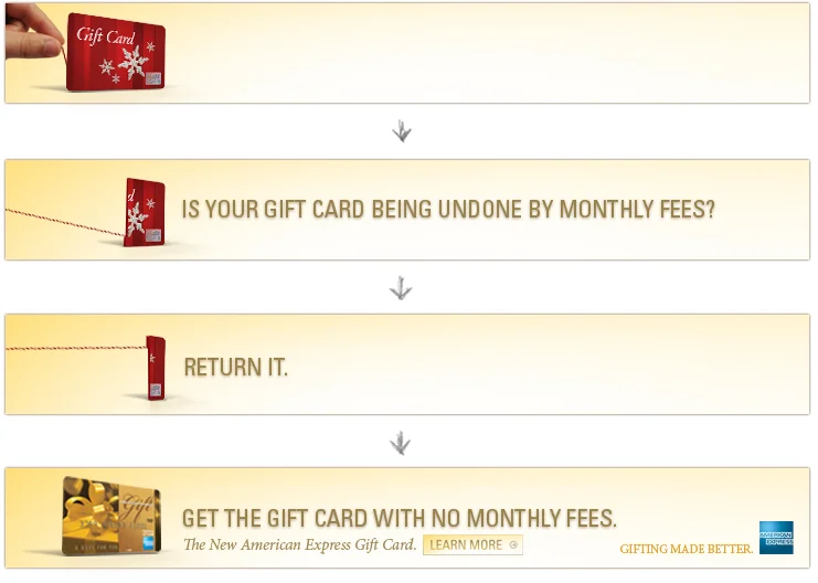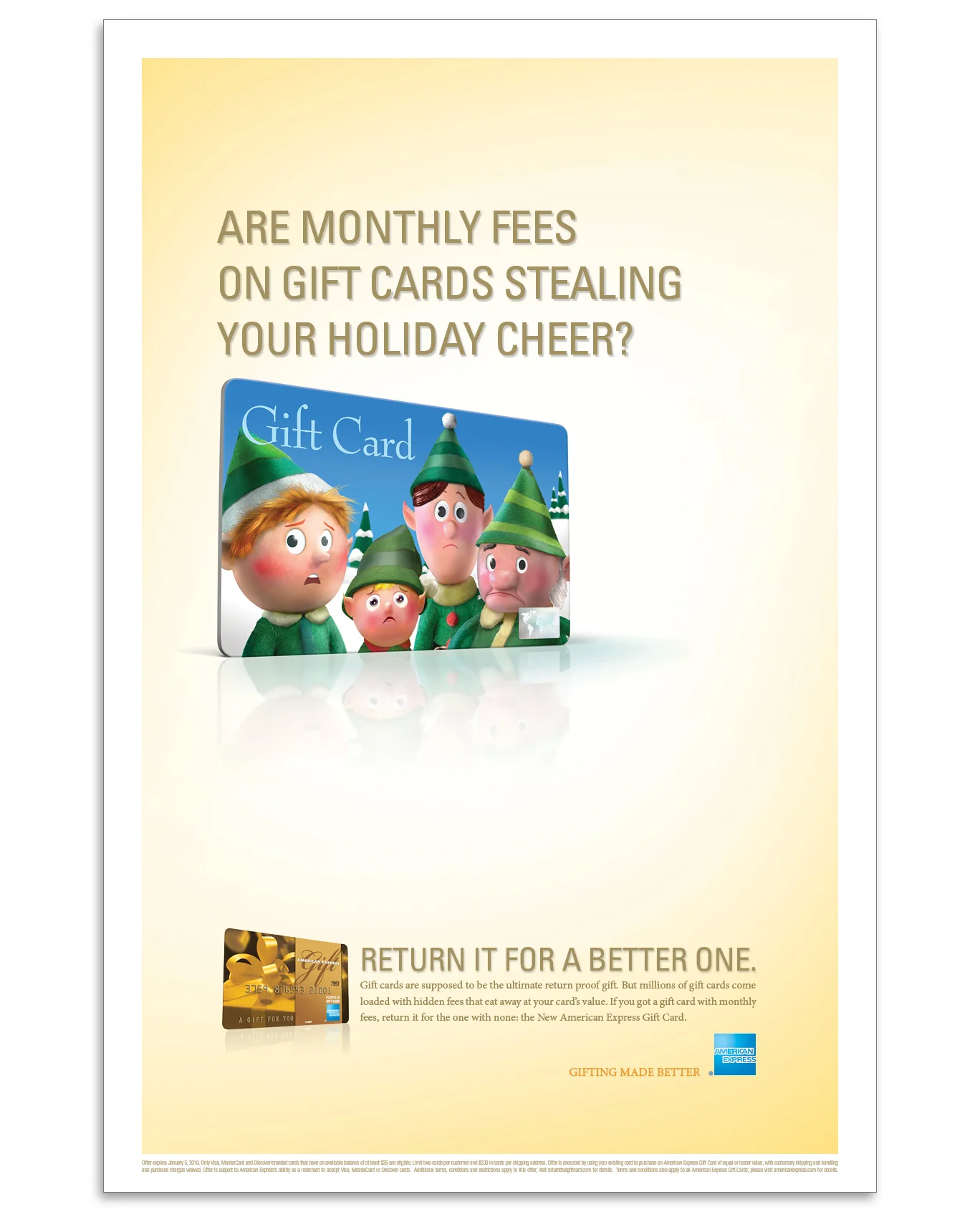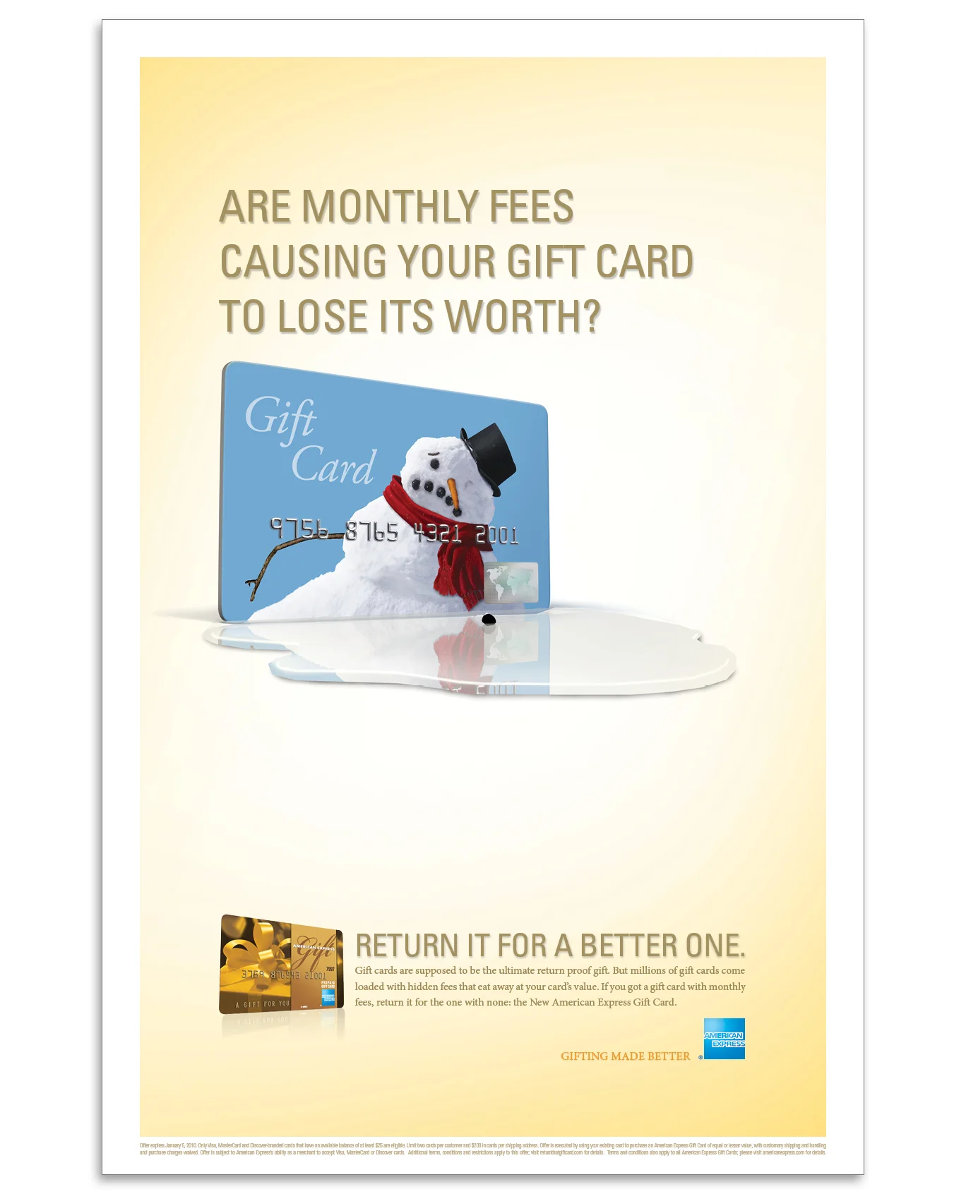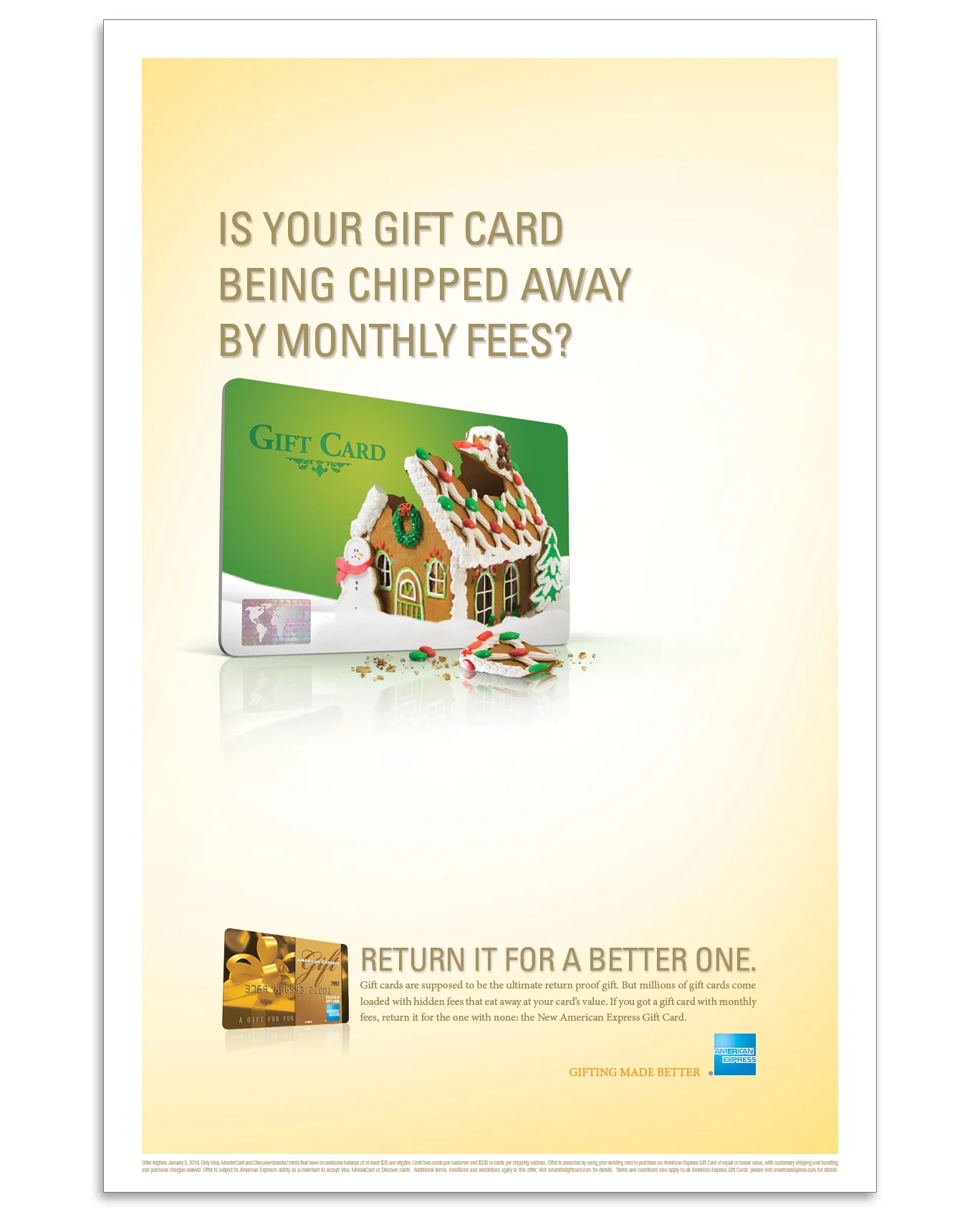 Gift cards from American Express don’t have fees or an expiration date, so their value never goes down. We created a program where people could trade in their lame gift cards for an American Express gift card of the same value.